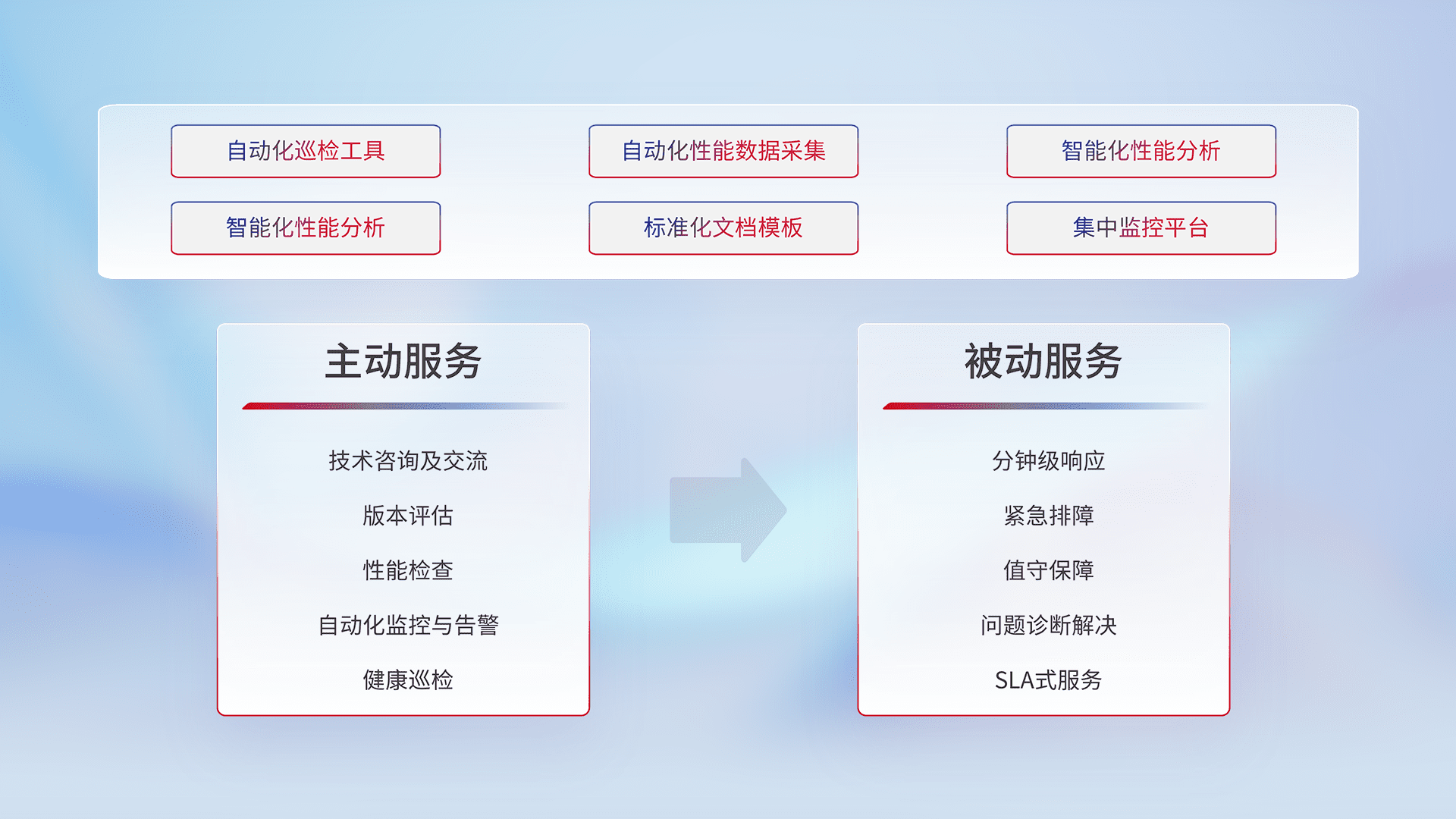 智能化工具和标准化文档,,,保障服务质量,,提供主动服务(包含技术咨询、、版本评估、、、性能检查、、、、自动化监控与告警、、、健康巡检)和被动服务包含(分钟级响应、、紧急排障、、、值守保障、、问题诊断解决、、SLA服务)。。。。